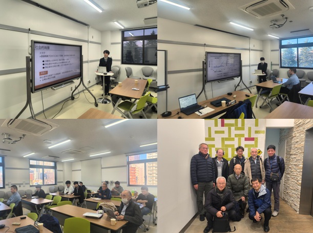 - 2025年12月19日(金)に太田先生と共に東北大学多元物質科学研究所・柴田浩幸先生の研究室を訪問し、表面加熱・表面検出レーザフラッシュ装置に関する打合せを行いました。その後、14時30分より、今年度3回目となる西主催のシンポジウムを同研究所南2号館にて開催しました。当日は、対面で14名、オンラインで7名の方にご参加いただきました。本学M2の伏見くん(池田研究室所属)、B4の中村くん(当研究室所属)、発表お疲れさまでした。非常によくまとめられていたと思います。それぞれ修士論文発表、卒業論文発表を控えていますが、この調子で頑張ってください。この後、西は18時から早稲田研究室OBの食事会に参加しました。皆さんのエネルギッシュさに驚かされました。食事会後の写真も掲載します。西は前列にいて気づかなかったのですが、早稲田先生、中腰の体勢ではないですか…。とても若々しいと感じました。現在、左肩が五十肩状態の西としては、もっと体のケアをしなければと思った次第です。さらに、この後三次会にも参加し、お開きは午前1時30分でした(汗)。(2025.12.20)