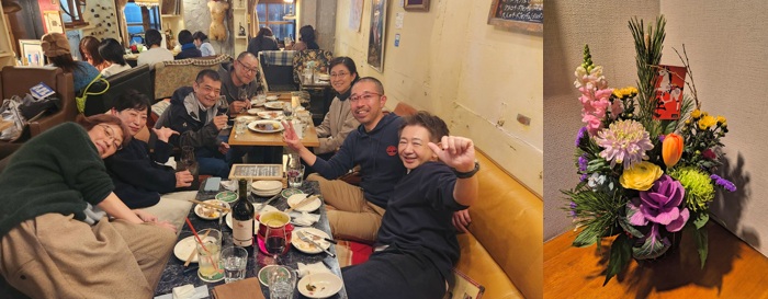 - 2024年も残すとこあと20日ほどです。今年は大甕にある「大衆バルビストロパッチョ」にて研究室の忘年会をしました。お店での研究室の忘年会は西にとっても久しぶりで、とても楽しい時を過ごしました。太田先生、事務補佐員の田仲さん、そして研究室の学生の皆さんもお忙しいところお集まり頂きありがとうございました。これから卒論、修論、学会と大変になるかと思いますが、ほどほどに息抜きをしながら乗り切っていきましょう。(2024.12.9)